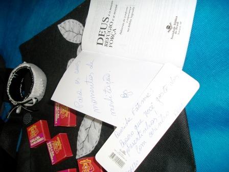 AMIGAS RECEBI MEU PRESENTE QUE GANHEI DO BLOG DA BETH-www.anabethartes.blogspot.com VEJAM FOI UM PRESENTÃO E EU AMEI TUDO COMBINANDO A BOLSA O CHINELO A PUSEIRA UM LIVRINHO PARA MEDITAR,UM CARTÃO E ATÉ A COCADA BAHIANINHA QUE ESTÃO NESSAS CAIXINHAS ROSA QUE VOCE VEEM AI.OLHA BETH EU FIQUEI MARAVILHADA E FELIZ PORQUE EU VI TODO O CARINHO COM O QUAL VOCE FEZ E EMBALOU TUDO,MUITO OBRIGADA AMIGA